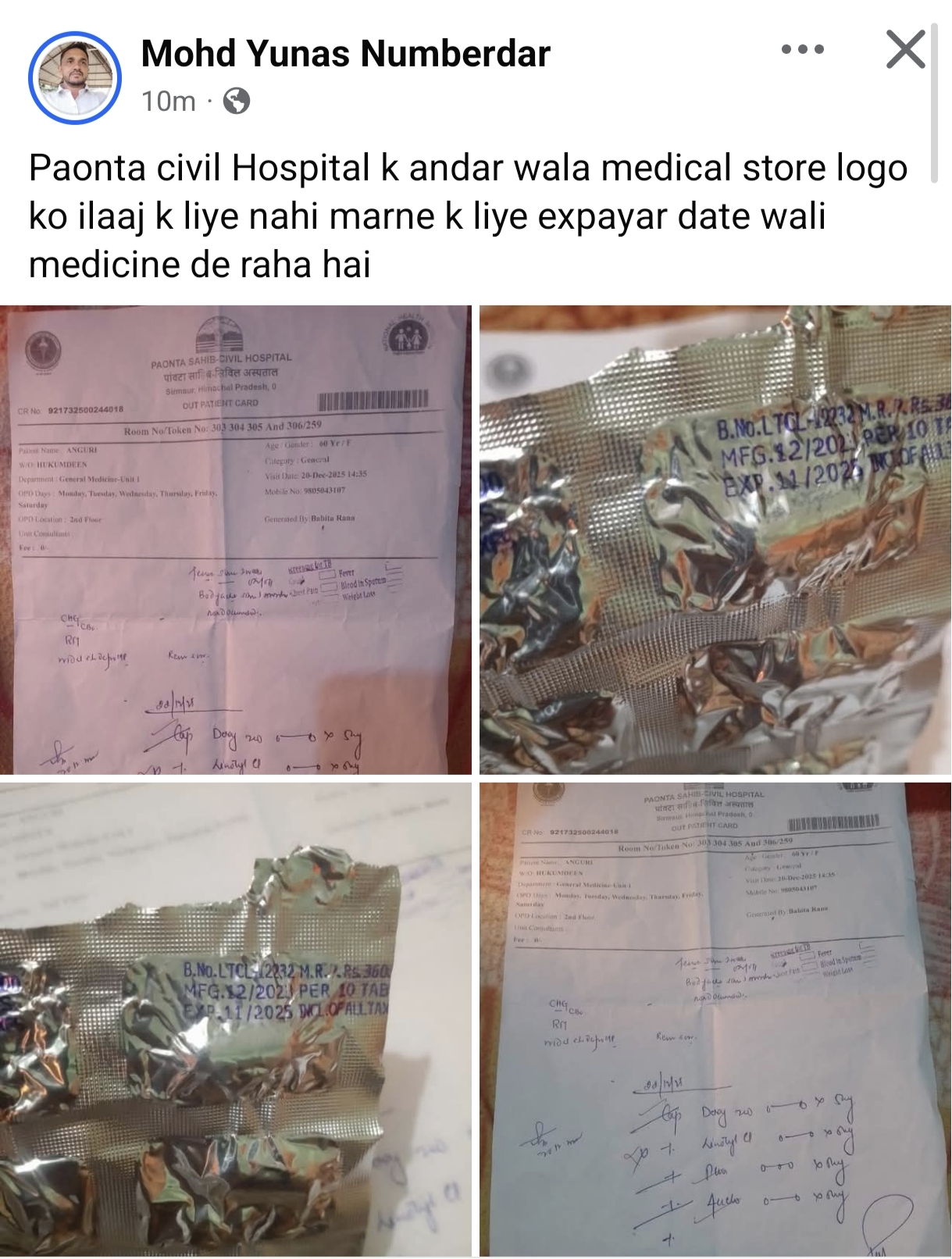 पांवटा साहिब के सिविल अस्पताल परिसर के अंदर संचालित मेडिकल स्टोर पर गंभीर आरोप सामने आए हैं। मरीजों और उनके तीमारदारों का कहना है कि उक्त मेडिकल स्टोर द्वारा एक्सपायरी डेट की दवाइयाँ खुलेआम मरीजों को दी जा रही हैं।