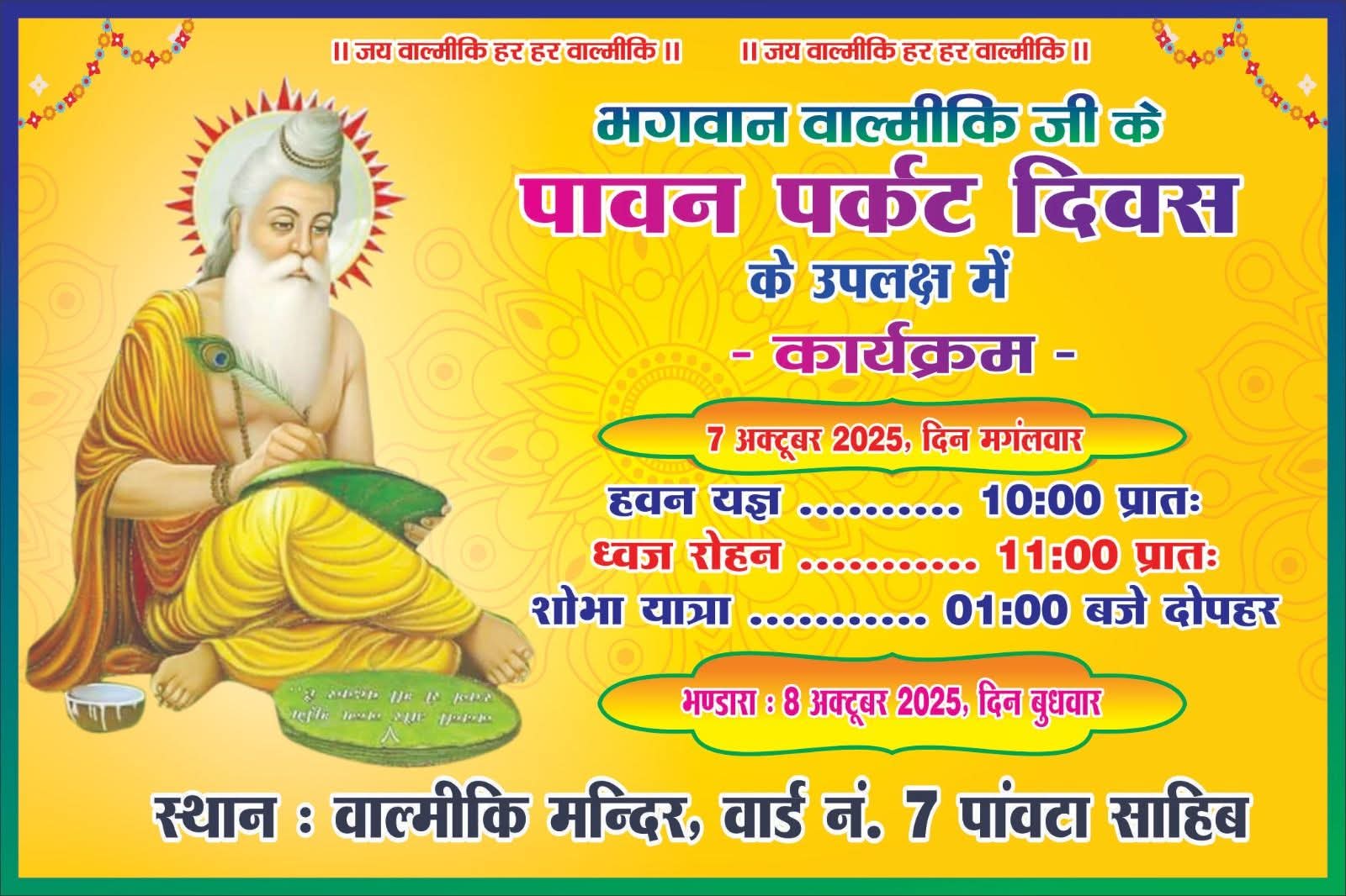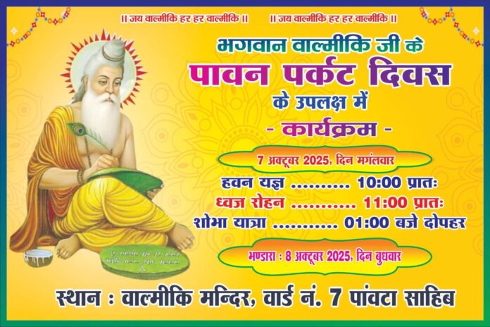 पांवटा साहिब में भगवान वाल्मीकि जी का पावन प्रकट दिवस भव्य धूमधाम और श्रद्धा के साथ मनाया जाएगा