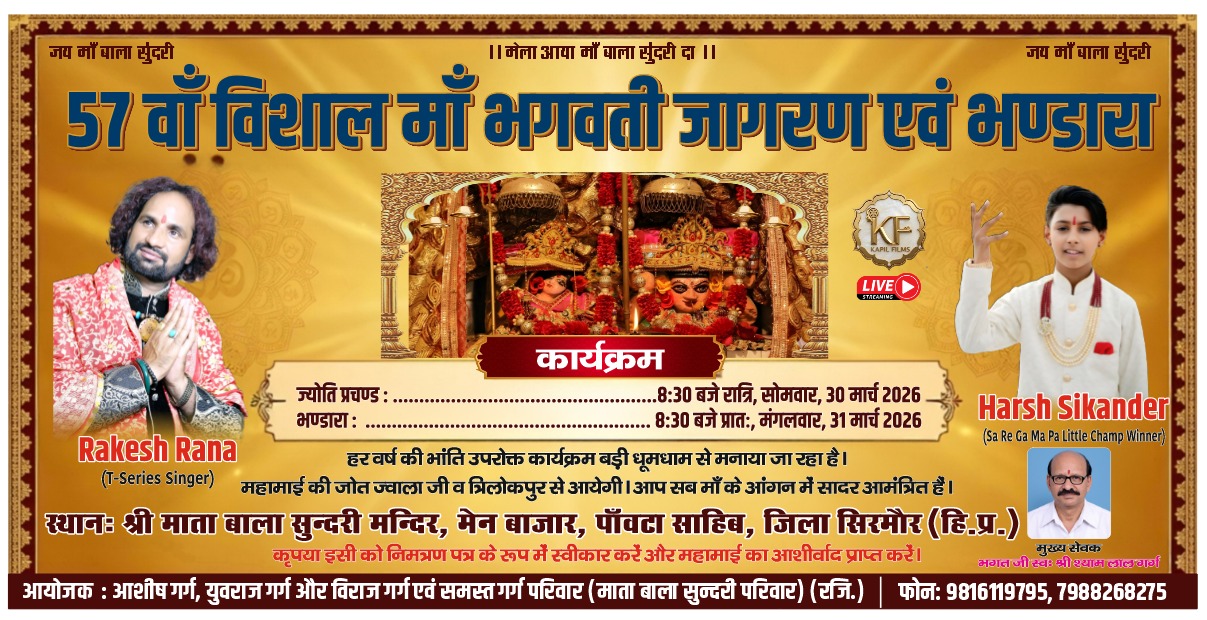श्री माता बाला सुंदरी मंदिर, मेन बाजार पांवटा साहिब में 57वें विशाल मां भगवती जागरण एवं भंडारे का भव्य आयोजन किया जा रहा है। हर वर्ष की तरह इस बार भी यह धार्मिक कार्यक्रम बड़े धूमधाम और श्रद्धा के साथ संपन्न होगा।