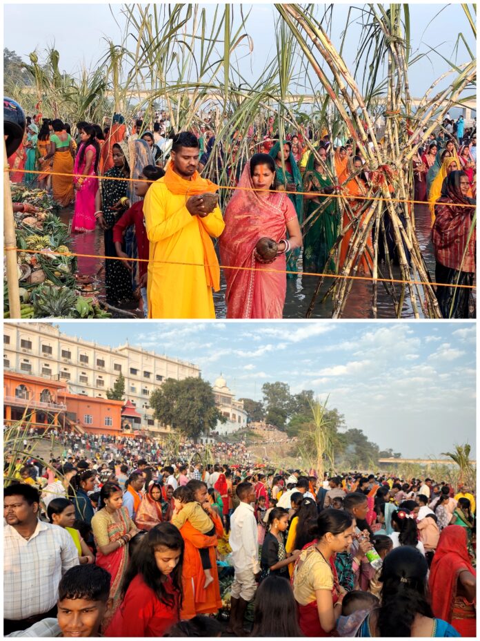 छठ व्रतियों ने नदियों और तालाबों में खड़े होकर अस्ताचलगामी सूर्य को अर्घ्य अर्पित किया और परिवार की सुख-शांति, समृद्धि तथा संतान की लंबी आयु की कामना की। महिलाएं अपने सिर पर पूजा का डाला लेकर खड़ी थीं, जिसमें ठेकुआ, फल, नारियल और दीप रखे गए थे।