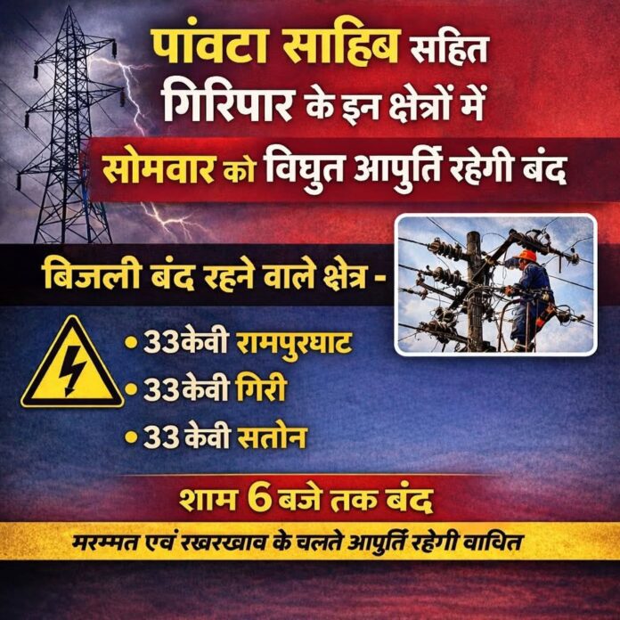 हिमाचल प्रदेश राज्य विद्युत बोर्ड, मंडल पांवटा साहिब में दिनांक 02.03.2026 (सोमवार) को बिजली आपूर्ति बाधित रहेगी। जिसके चलते सभी आमजन अपने जरूरी कार्य समय से निपटा लें।
