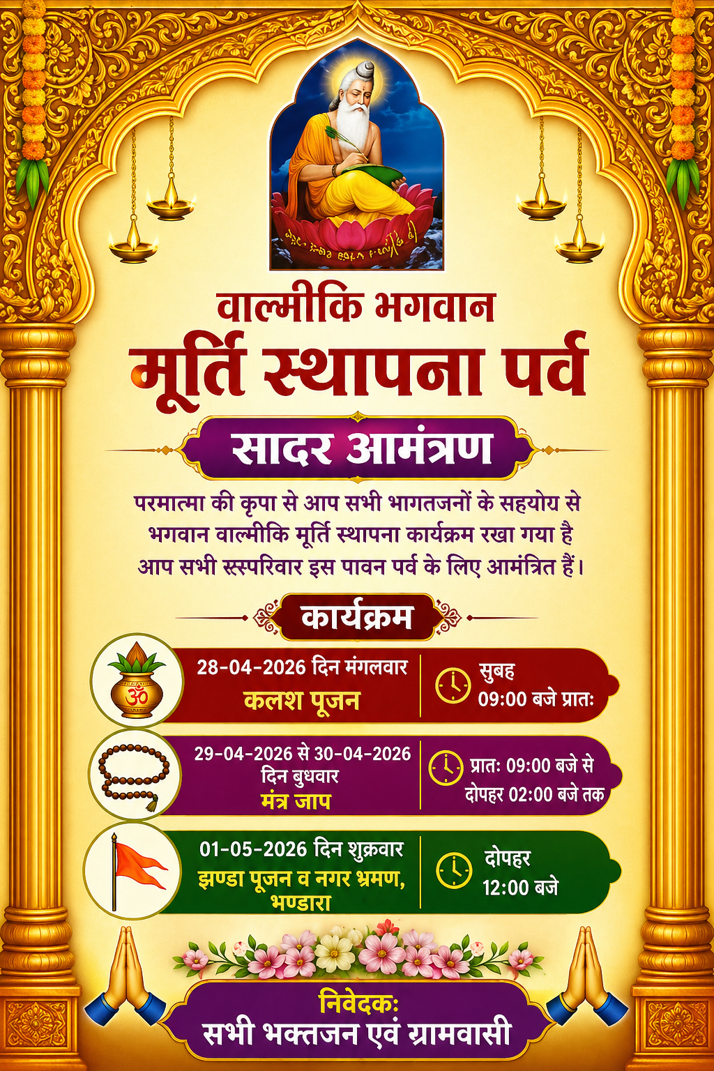 क्षेत्र में धार्मिक आस्था और उत्साह का माहौल देखने को मिल रहा है, जहां वाल्मीकि समाज द्वारा भगवान वाल्मीकि जी की मूर्ति स्थापना पर्व का भव्य आयोजन किया जा रहा है। इस पावन अवसर पर सभी श्रद्धालुओं और ग्रामवासियों को सपरिवार आमंत्रित किया गया है।