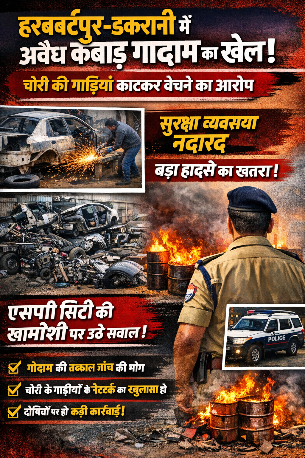क्षेत्रवासियों ने मांग की है कि अवैध कबाड़ गोदाम की तत्काल जांच कराई जाए, चोरी की गाड़ियों के नेटवर्क का खुलासा हो और दोषियों के खिलाफ कड़ी कार्रवाई की जाए, ताकि किसी बड़े हादसे से पहले प्रशासन जाग सके।