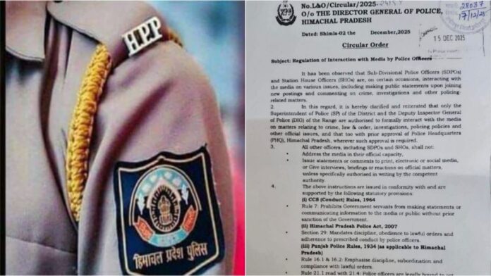 हिमाचल प्रदेश में पुलिस अधिकारियों के मीडिया ब्रीफिंग को लेकर पुलिस मुख्यालय ने सख्त निर्देश जारी किए हैं. पुलिस महानिदेशक (डीजीपी) की ओर से जारी एक सर्कुलर में साफ किया गया है कि अब सब डिविजनल या थाना स्तर के अधिकारी मीडिया से अपने स्तर पर कोई बयान नहीं देंगे. यह आदेश कानून-व्यवस्था, अपराध, जांच और पुलिस से जुड़े सभी आधिकारिक मामलों पर लागू होगा.