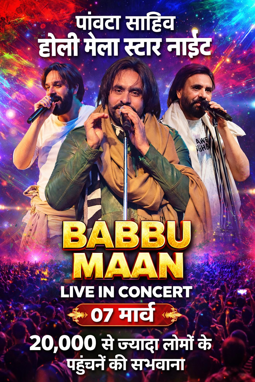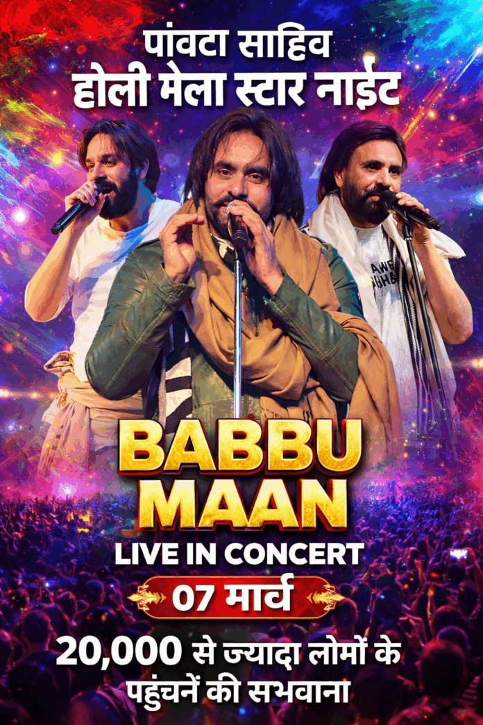 पांवटा साहिब होली मेला के तहत 07 मार्च को आयोजित होने वाली स्टार नाइट में मशहूर पंजाबी गायक Babbu Maan के लाइव प्रोग्राम को लेकर शहर में जबरदस्त उत्साह है। अनुमान है कि कार्यक्रम में 20,000 से अधिक लोग पहुंच सकते हैं, जिससे प्रशासन के सामने भीड़ प्रबंधन की बड़ी चुनौती खड़ी हो सकती है।